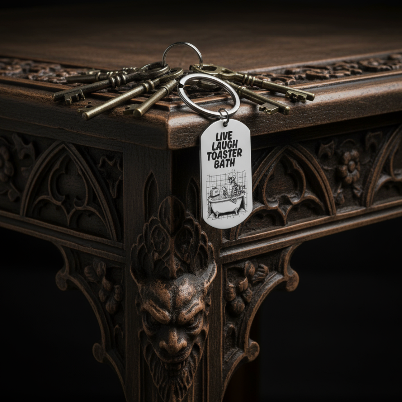 Morbidly hilarious and unapologetically bold, this laser engraved stainless steel keyring features the viral-worthy phrase “Live Laugh Toaster Bath” paired with a skeleton lounging in a bathtub with a toaster. It's the perfect blend of gothic humour, emo vibes, and internet sarcasm, all in the palm of your hand.